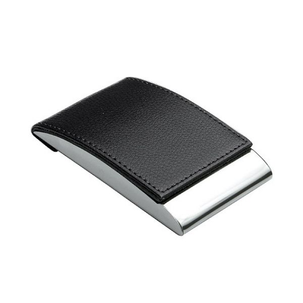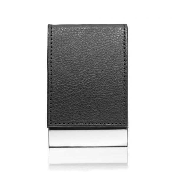 Metall-Visitenkartenetui verchromt. Der Deckel hat einen Magnetverschluss und ist mit Öko-Leder überzogen. Fassungsvermögen - 10 Stk. Das Logo wird auf der Metall-Leiste graviert.