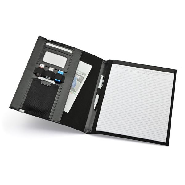 In ihrem Inneren verbirgt die Konferenzmappe eine große Tasche für Dokumente, 3 kleine Taschen davon 1 mit Fenster, 3 Gummihalterungen für z. B. USB-Sticks und eine Tasche für Mobiltelefone oder Taschenrechner. Zudem enthält der Organizer einen Notizblock (20 Blatt A4 ). - Maße 310 x 245 x 15 mm - Material PU-Leder, Papier, Metall Gerne veredeln wir Ihnen dieses Werbegeschenk mittels einer Gravur (30 x 70 mm) oder eines Siebdrucks (60 x 60 mm).