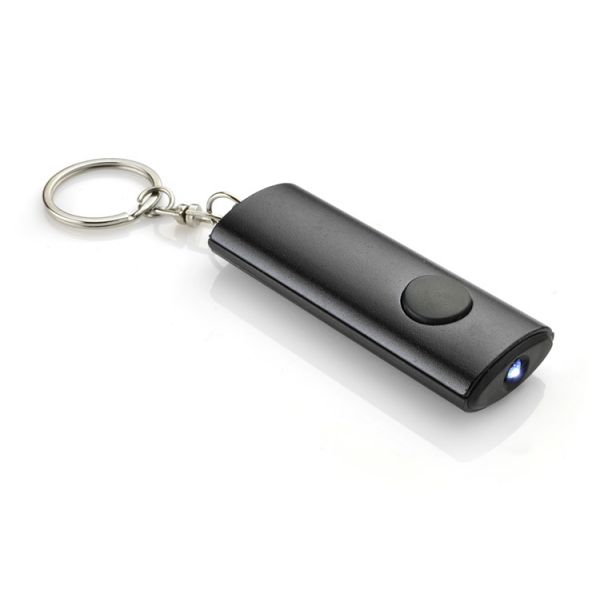 Praktischer Schlüsselanhänger mit Taschenlampe. Das Logo wird auf der Fläche graviert.