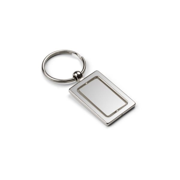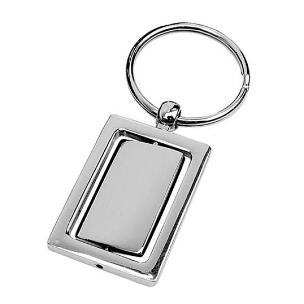Schlüsselanhänger Chrom-Metall. Der innere Rechteck ist drehbar. Gravur kann auf beiden Seiten aufgetragen werden. Gepackt in eine schwarze Box.
