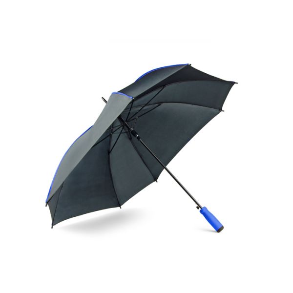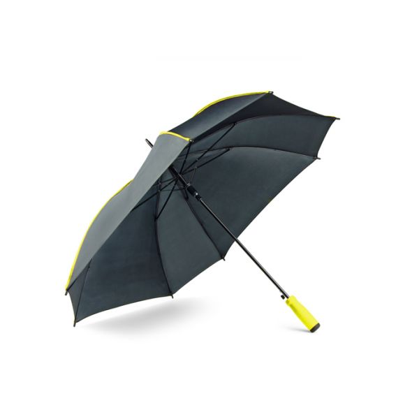 Automatischer Regenschirm mit ungewöhnlicher quadratförmiger Form. Regenschirm mit Schale in schwarzer Farbe und buntem Akzent auf der Außenseite. Paneele mit unterschiedlicher Breite zur Anbringung eines größeren Logos als auf einem Standardregenschirm. Regenschirmgriff aus weichem EVA-Schaum fürs angenehme Tragen des Regenschirms. Die Schale ist aus Polyester 190T gefertigt.