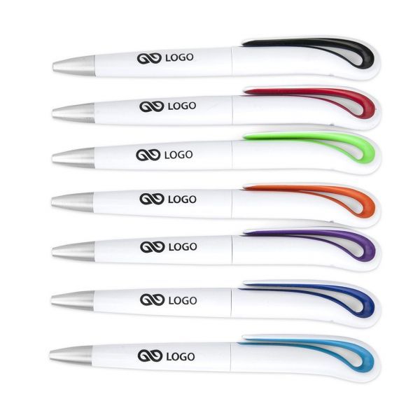 Ganz in Weiß gehalten, am Ende mit einem farbigen Hingucker am Drücker, der elegant geschwungen ist, das ist unser schwarzschreibender Werbekugelschreiber Adrian. Die Farbe des Drückers können Sie aus den Farben Navyblau, schwarz, grün, rot, orange, lila und hellblau wählen. Inklusive ist bereits ein einfarbiger Druck auf eine Position am Korpus.